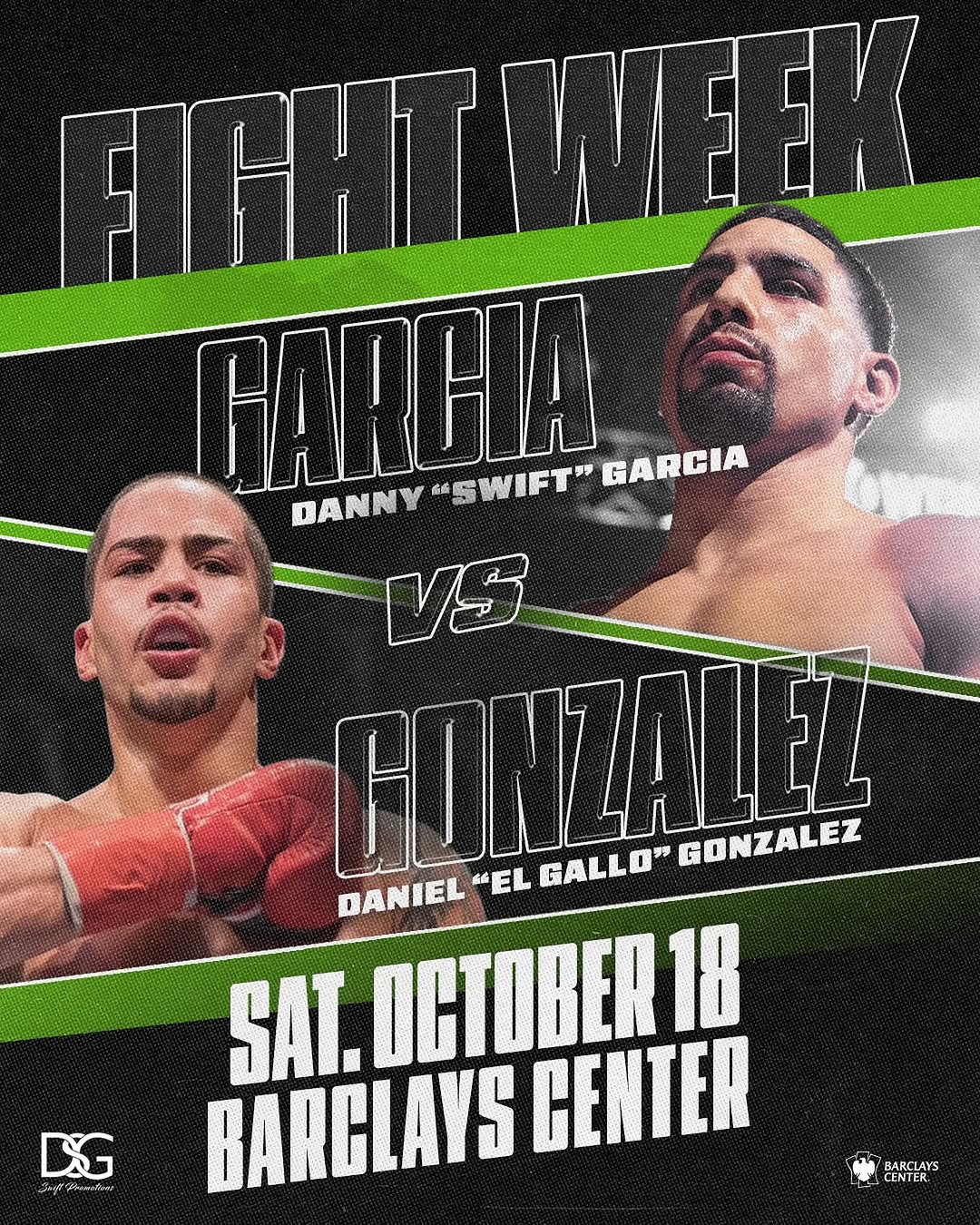 El ex campeón mundial de dos divisiones Danny “Swift” García, regresará al ring en los confines amigables del Barclays Center de Brooklyn, este sábado 18 de octubre, contra Daniel «El Gallo» González, en un evento “Despedida a Brooklyn”, que celebrará a los fanáticos y al estadio que han apoyado a García a lo largo de su legendaria historia de ofrecer momentos memorables en el transcurso de su carrera.