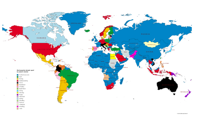 Arriba el mapa creado por Koozai para mostrar los deportes más seguidos entre los países competidores