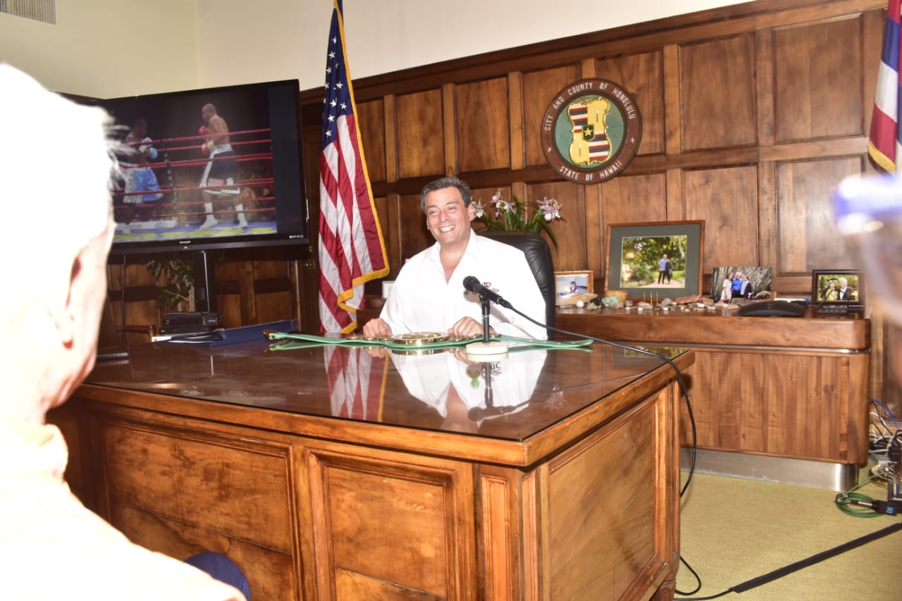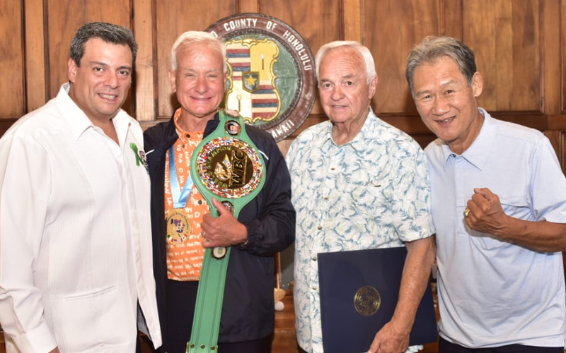 Este jueves se entregó el cinturón de campeón mundial al Alcalde de Honolulu, Hawai, Kirk Caldwell, de manos del presidente del Consejo Mundial de Boxeo, Mauricio Sulaimán, junto a Craig Hubble, presidente de la NABF.
