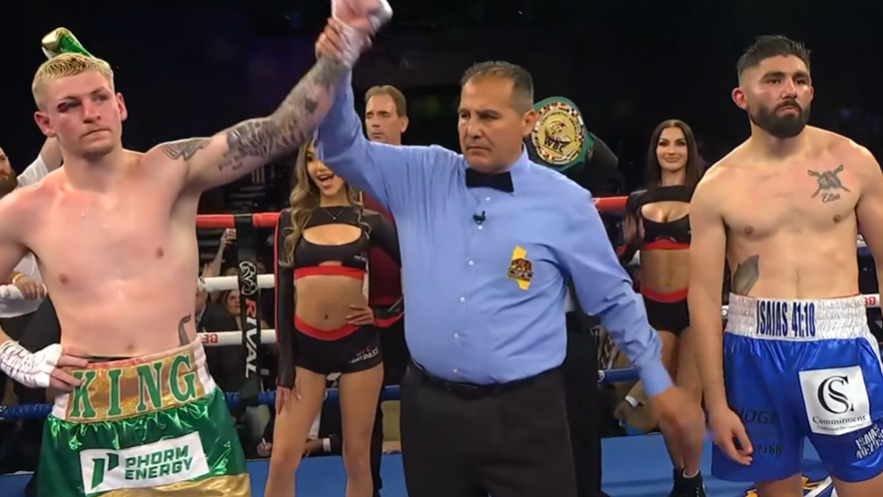 ”King Callum Walsh 14-0, 11 KO`s successfully defended his WBC Continental Americas Super-welterweight Championship for the fourth time with a fifth round technical decision victory over Elias Espadas 23-7-1, 16 KO`s at the Chumash Casino, Santa Ynez, California.
