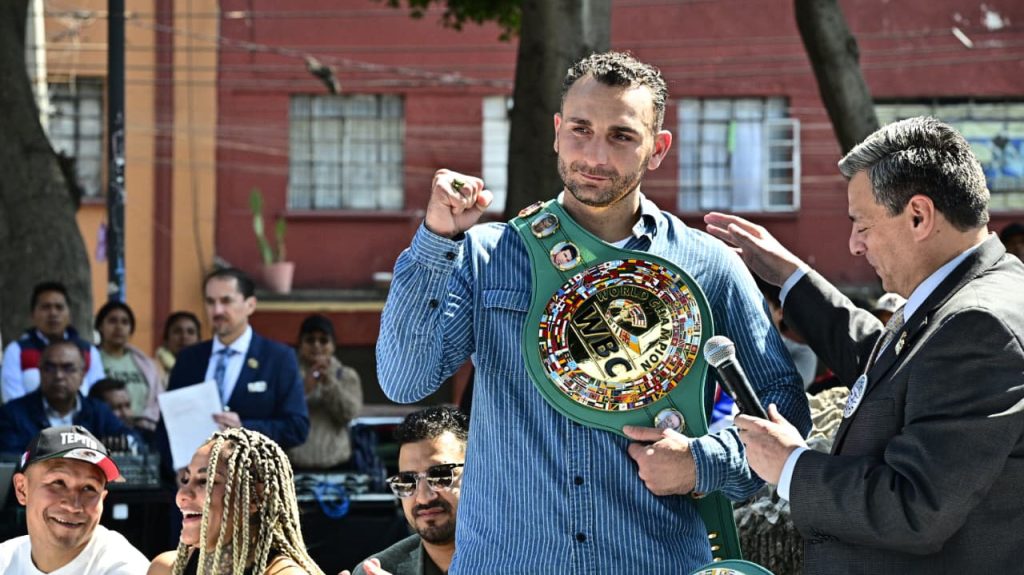 The WBC new, and two time Cruiserweight Champion Noel Gervor Mikaelian has been presented the fabled Green and Gold Belt and Signet Ring, by World Boxing Council President Mauricio Sulaiman, at the Monument of the Boxer, in the heart of Tepito, which has produced boxing legends Raul “Raton” Macias and Ruben “Puas” Olivares,