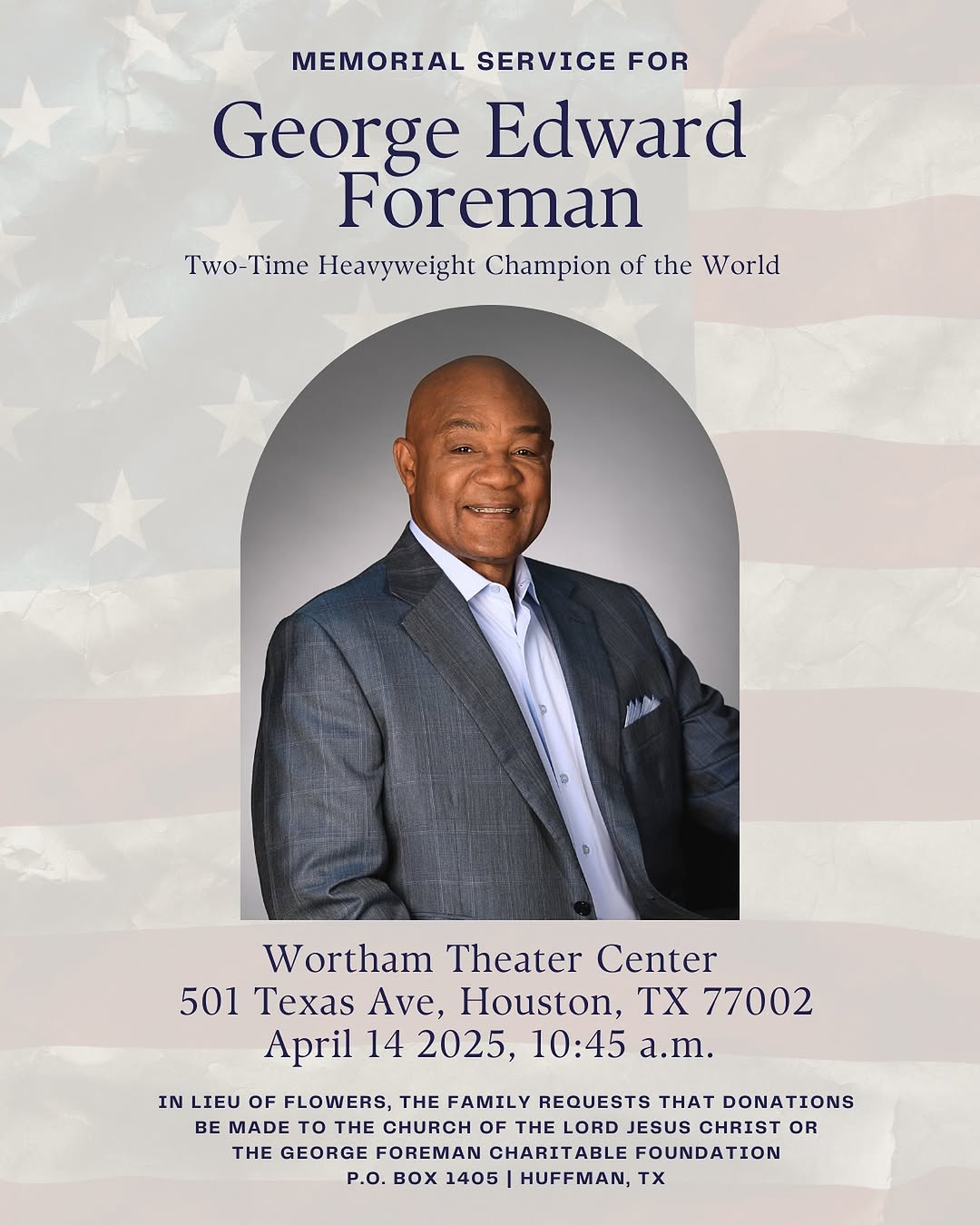 Although admission will be free, registration is required at the following link as seating is limited: https://performingartshouston.org/events/memorial-service-for-george-foreman-2025-04-14-1100-am/?display=true&fbclid=PAZXh0bgNhZW0CMTEAAadEVxkFfFPju_vB6j-5wAhTZ4iBOcTPsnefzkePfWs1MagV2xPtizEdJXc0Hw_aem_xQW-xVOWoScyUgnKmojz_g