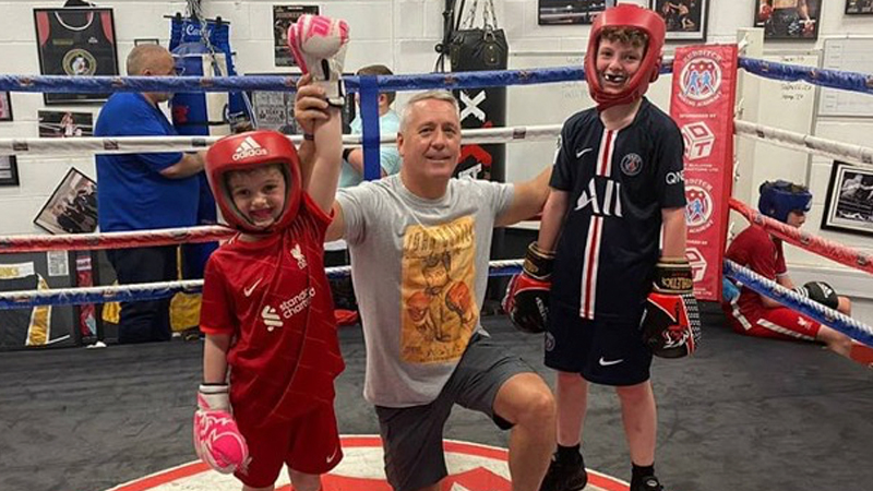 Mark, helps with coaching at the Anfield Boxing Club in Liverpool, established and run by Alan Walsh. Their aim to get youngsters off the streets, steering them away from crime, drugs and from carrying knives. The slogan Real Men Don`t Carry Knives, is embossed on shirts and shorts. Mark says the coaching is to instil self-worth, dedication, direction, purpose, and pride in the youngsters.
