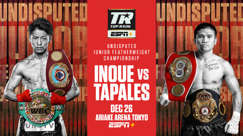 Inoue, already a four-division world champion, seeks to become the second fighter to earn four-belt undisputed status in a second division. Inoue-Tapales and undercard bouts will stream live and exclusively in the U.S. on ESPN+ in a special early-morning presentation.