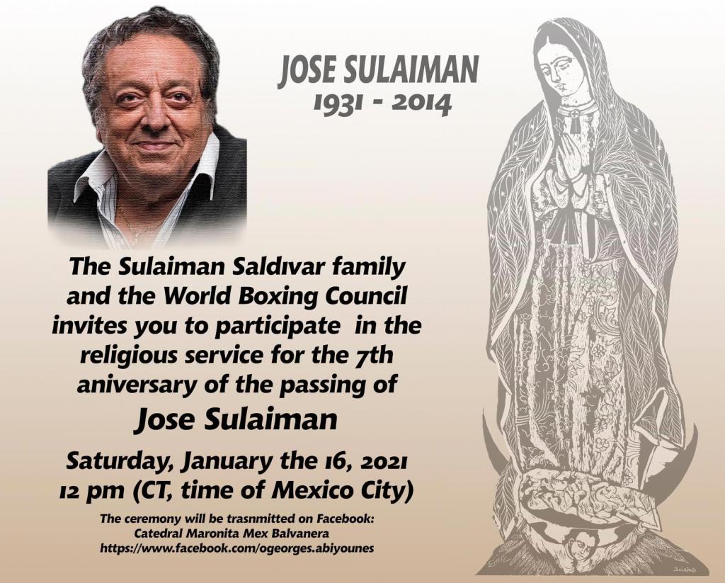 The Sulaiman Saldivar family and the World Boxing Council invite you to participate in the religious service for the 7th anniversary of the passing of Don Jose Sulaiman this Saturday, January 16th, 2021 12:00 p.m. (CT, time of Mexico City)