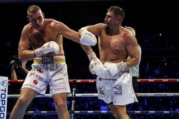 Agit Kabayel returned home and, before a sell-out crowd at the Rudolf Weber Arena in Oberhausen, gave an exhibition of courage, bravery, and potent punching power. His opponent, Poland’s Damian Knyba, came out determined to win the WBC belt; he started by dominating with jabs and opening a cut on Kabayel’s right eyebrow with an uppercut.