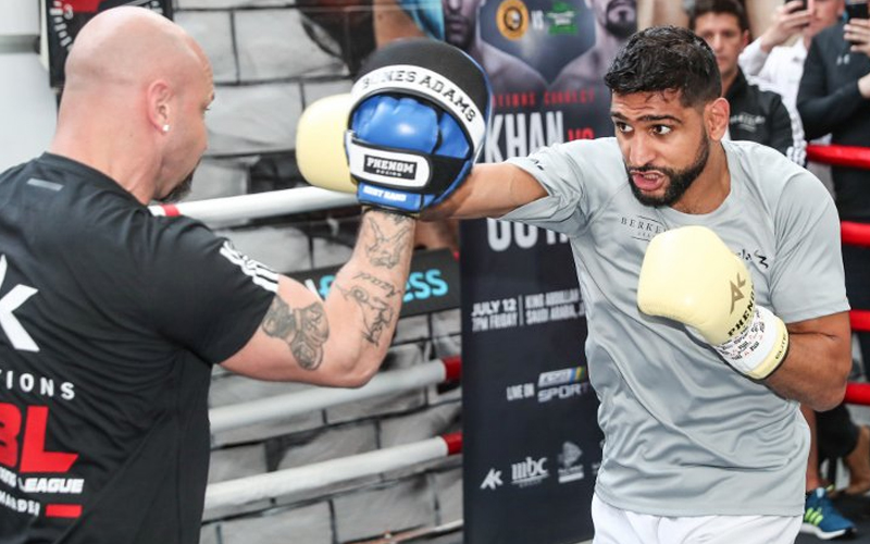 Two-time world champion, Amir Khan, offered a training session sparkling with energy, at his gym in Bolton, before traveling the WBC Pearl Belt route to Saudi Arabia for the fight against Neeraj Goyat of India.