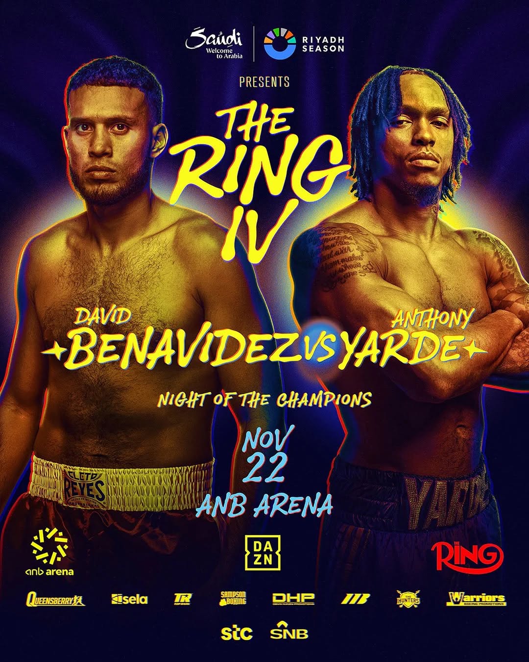 For David Benavidez 30-0, 24 KO`s it’s a voluntary defence of his WBC light heavyweight Green and Gold Belt, against Anthony Yarde 27-3, 24 KO`s. But and yet, it`s also a test under fire and a beacon indicator, to underline his power and command of the division. To undermine he who dares to usurp. It never ‘’Reigns!’’ To add majesty and the glamour of Arabian nights, it`s going to be on November 22nd at the ANB Arena in Riyadh and super-flyweight fresh-faced champion and Tiny Terror Jessie ‘’Bam’’ Rodriguez is also on the bill. What an impactful evening lies ahead!