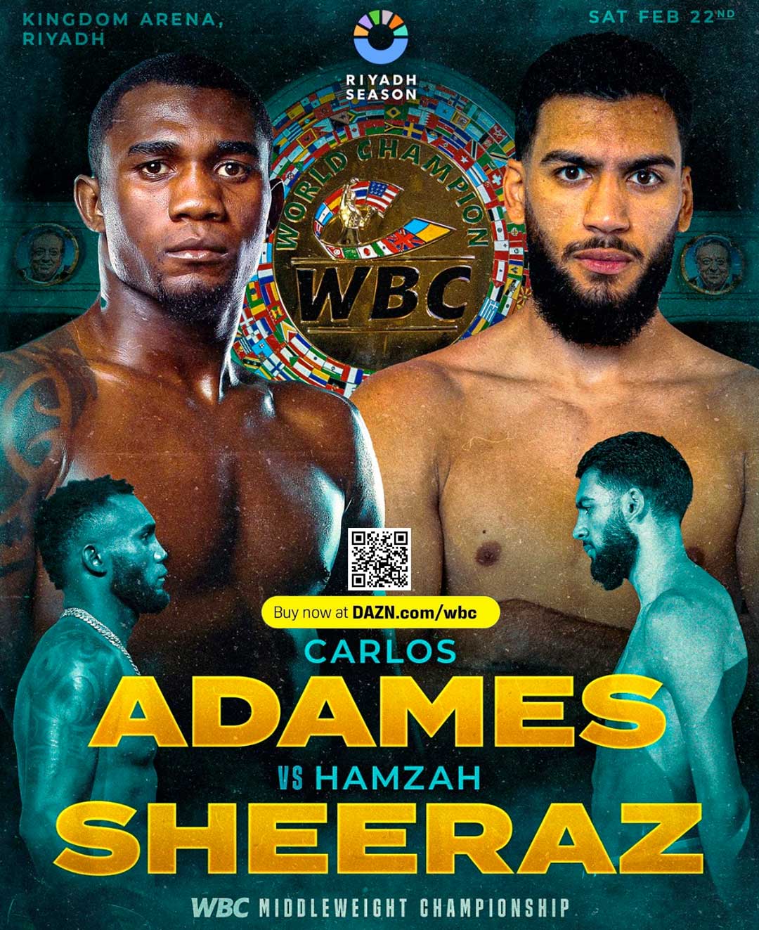 WBC middleweight champion Carlos Adames defends his Green and Gold Belt against lanky Hamzah Sheeraz on a night, which will be long remembered at the Kingdom Arena in Riyadh, SaudI Arabia on Saturday February 22nd.