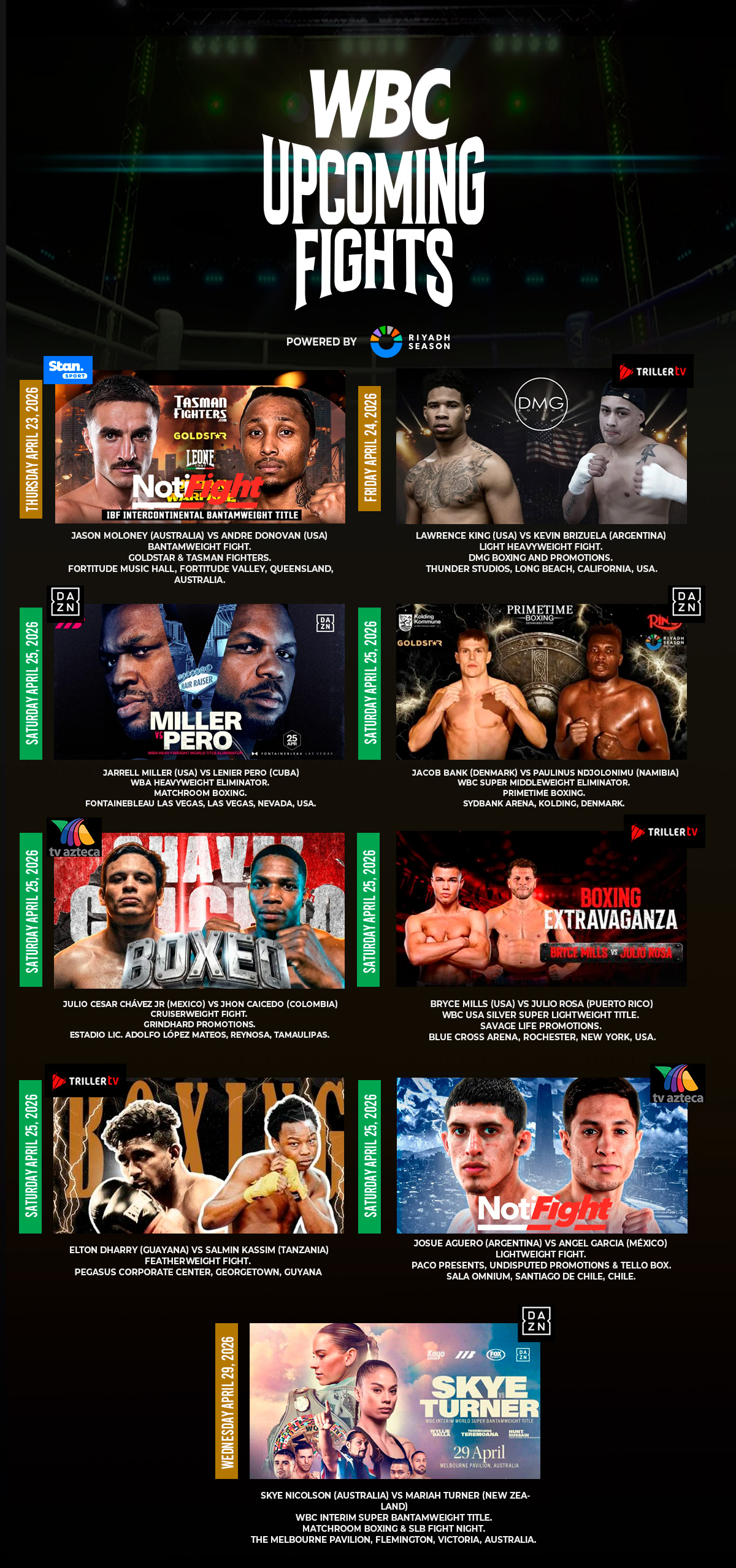 The World Boxing Council presents this week’s television agenda, highlighting the premier matchups in international boxing. Stay up to date with the programming and catch all the action across various platforms and broadcast networks