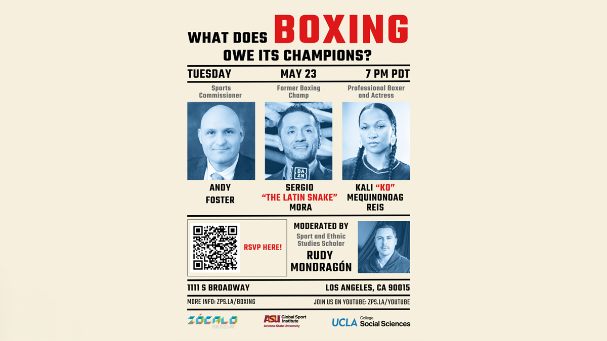 The Panel will reflect on boxing’s future—as an athletic endeavor, as a business, and as a cultural force—in California and beyond. A reception with food and drink will follow the conversation.
