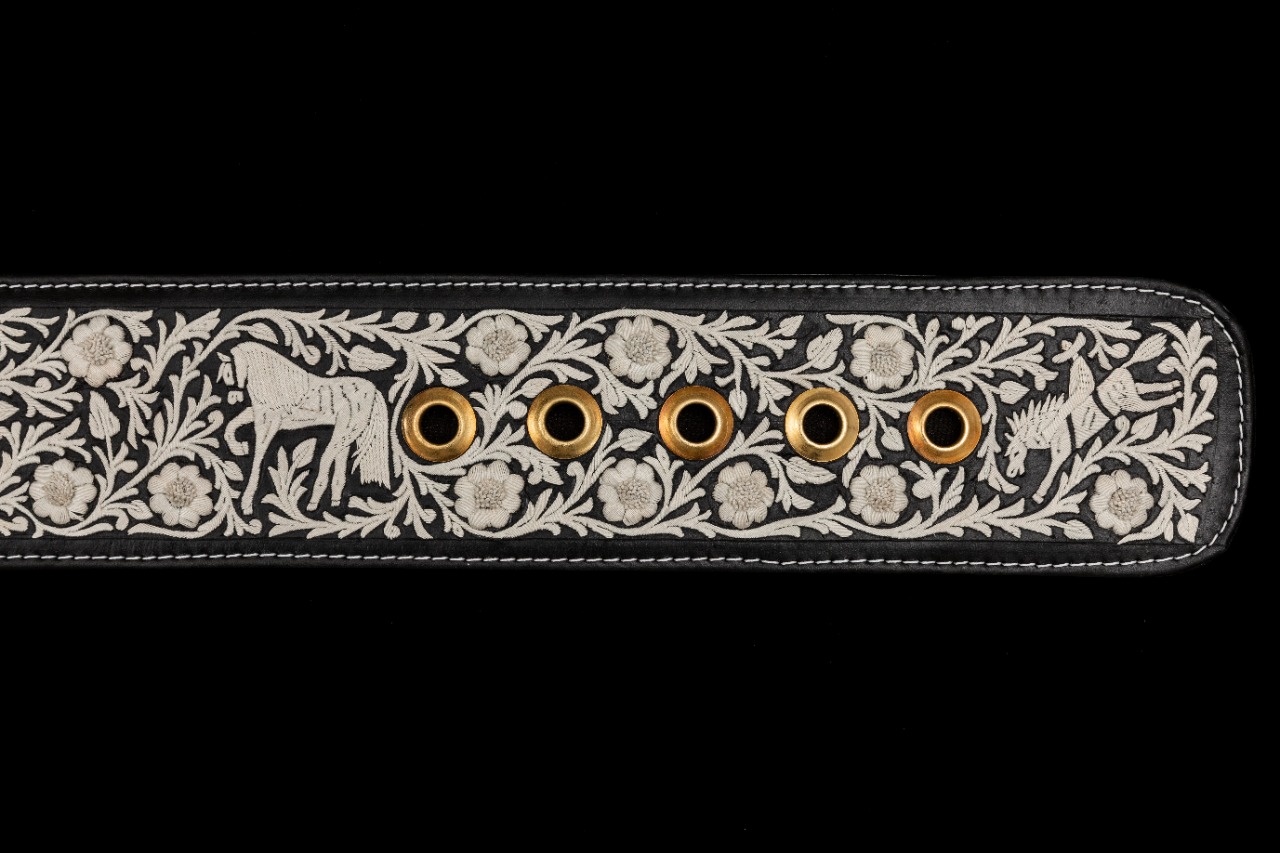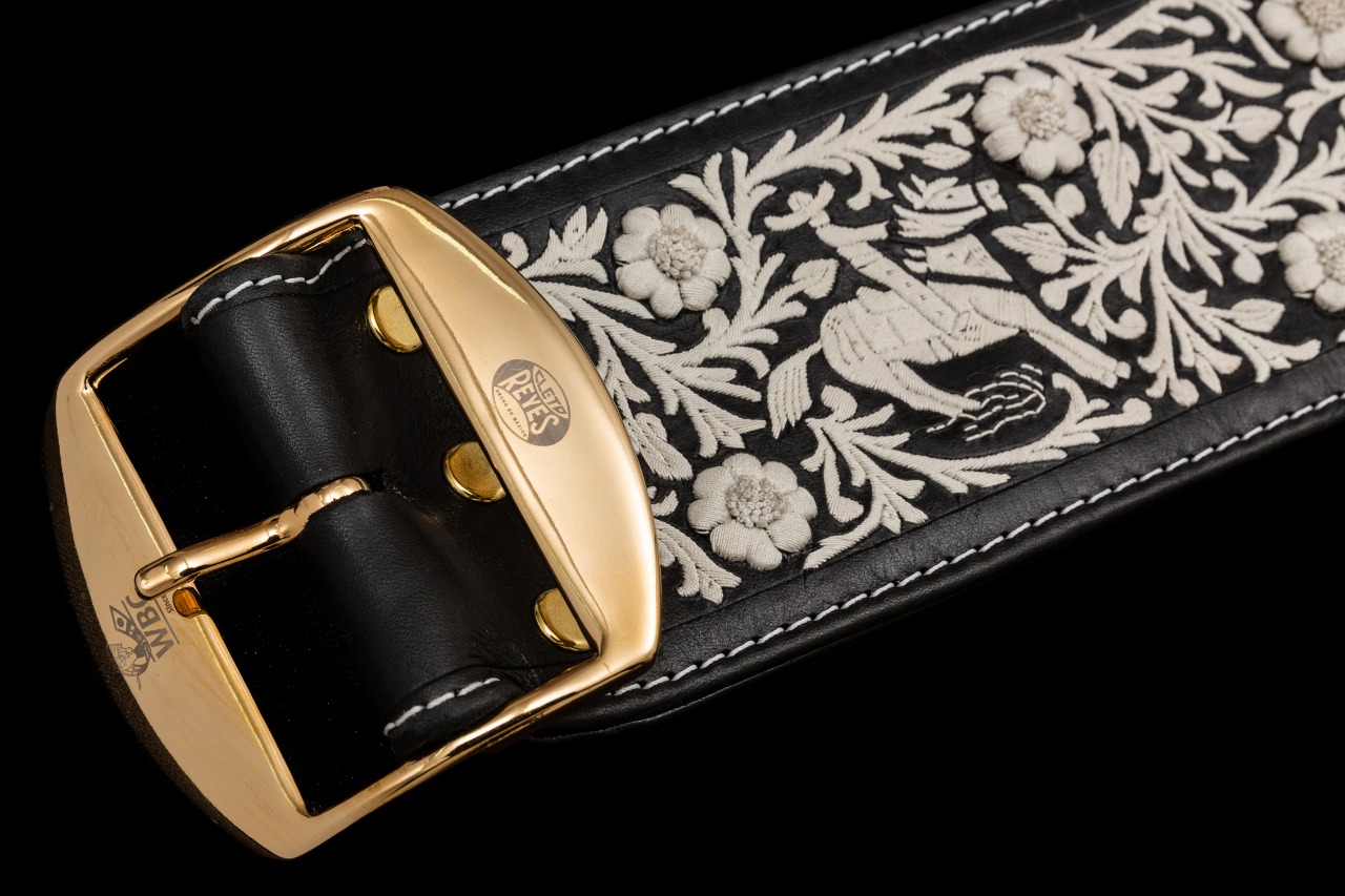 Se suma a esta línea de bordado otra suerte charra que es la jineteada y por último el floreo de reata. Todo esto va adornado con guías de ornato y flores en realce que, además de incrementar su belleza también evidencian el talento de las manos artesanales que lo elaboran. Este cinturón está hecho con el corazón de México.