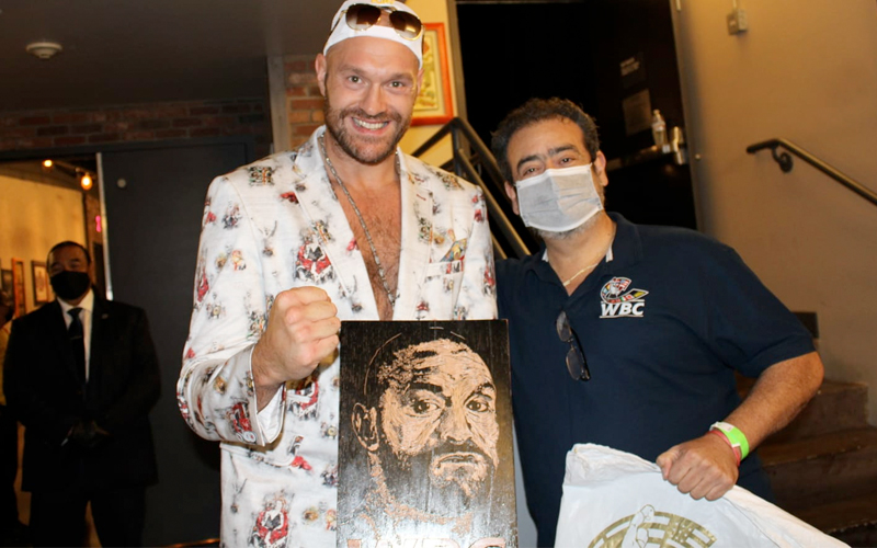 Pepe Sulaimán, representante del Consejo Mundial de Boxeo en Los Ángeles, California, entregó una obra de arte de su autoría al campeón de peso completo del organismo, el británico Tyson Fury.