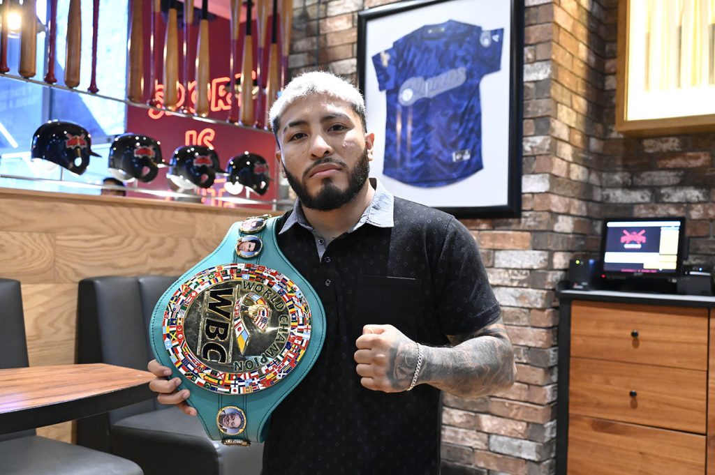 Muchas felicidades, campeón. Es un orgullo lo que representas para el boxeo y te deseamos lo mejor como monarca mundial. Queremos a parte de darte tu cinturón de campeón mundial, este mini belt, para tu pequeño, tu motivación y tu motor. Enhorabuena, Campeón, eres ahora parte de una división histórica para el boxeo mexicano.