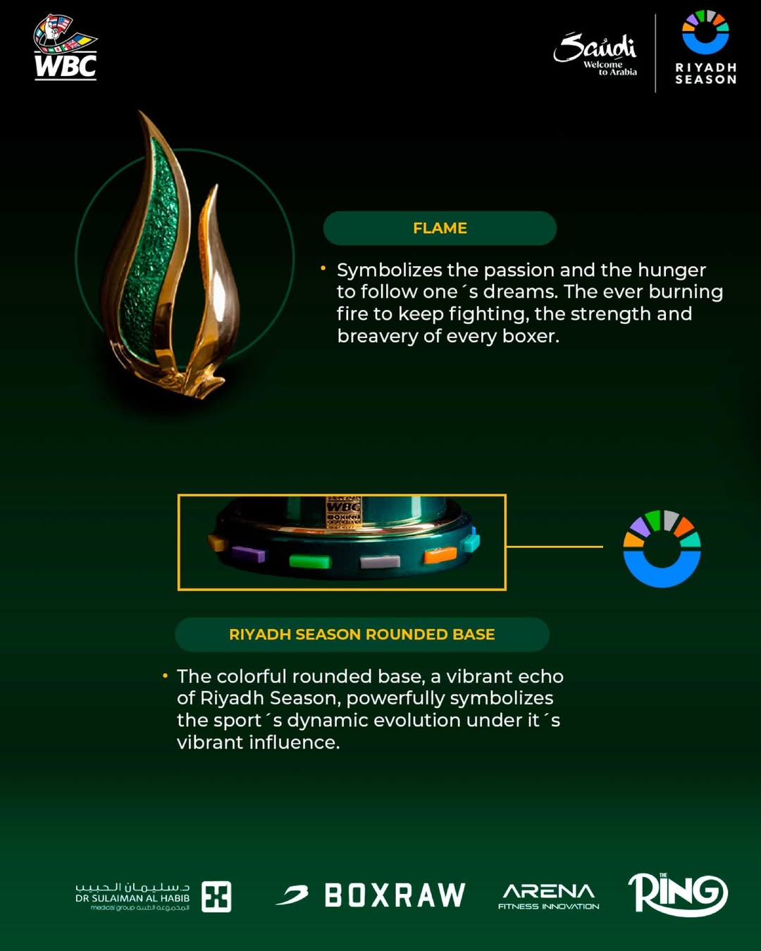 El trofeo está compuesto por una base redonda verde donde podemos apreciar 6 elementos de alto relieve de diferentes colores. Este es un eco vibrante de Riyadh Season que simboliza la dinámica y la evolución del deporte.
