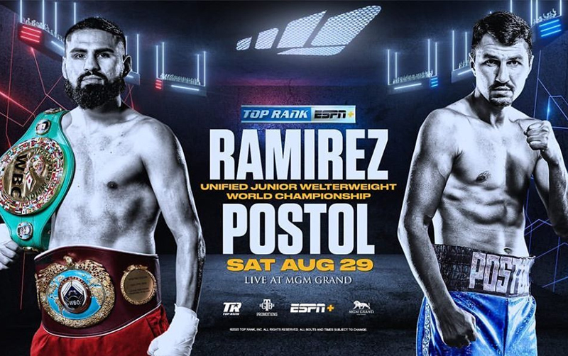 El esperado combate entre el campeón superligero del Consejo Mundial de Boxeo, Jose Carlos Ramírez y el ucraniano excampeón mundial Viktor Postol, se llevará a cabo el 29 de agosto en la Burbuja del MGM Grand de Las Vegas.