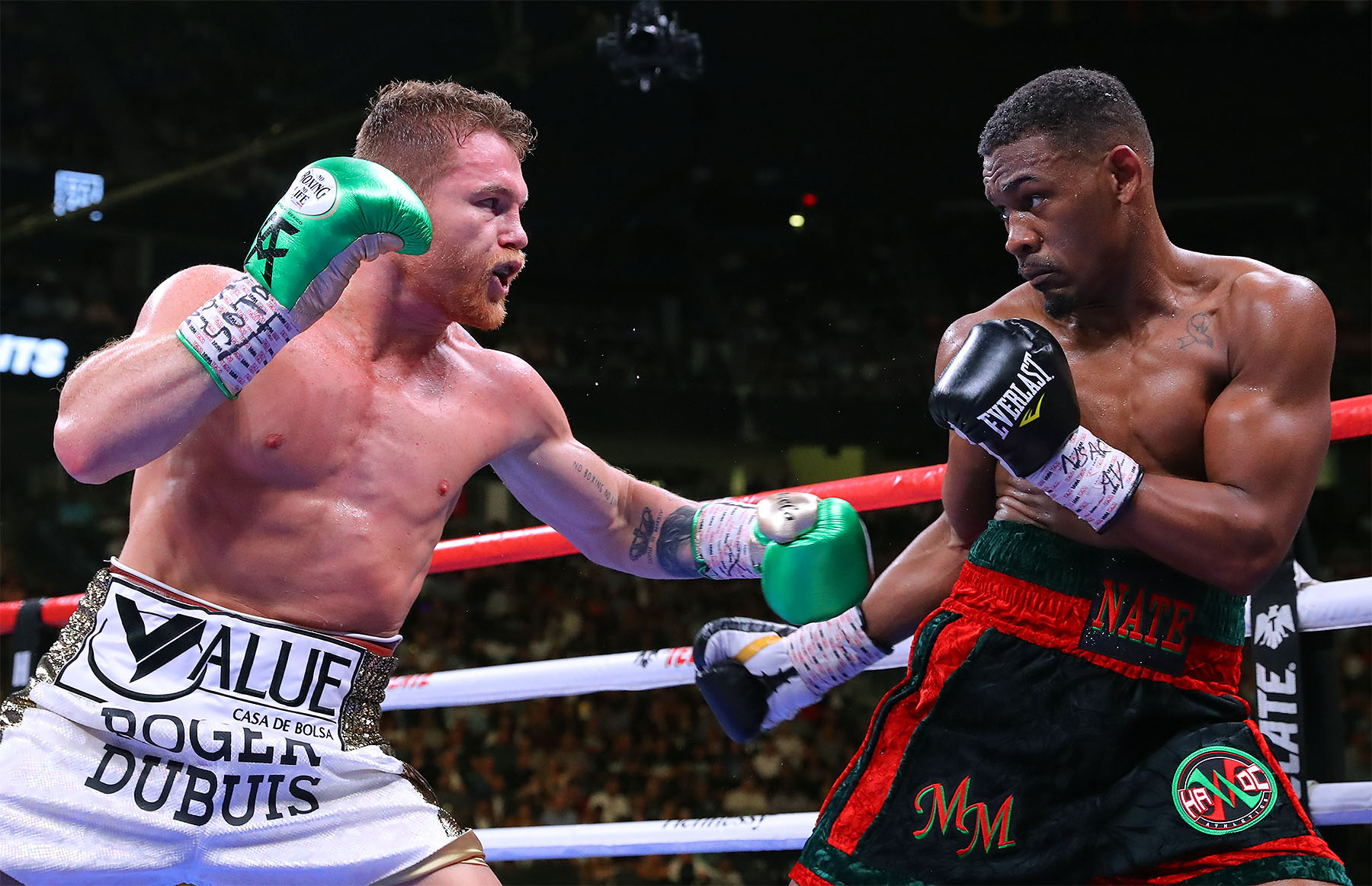 Saúl «Canelo» Álvarez se llevó la primera mitad de la pelea, yendo siempre hacia adelante, intentando conectar a un elusivo Jacobs, que inició la pelea en forma cautelosa debido a la amenaza latente que representa el mexicano.