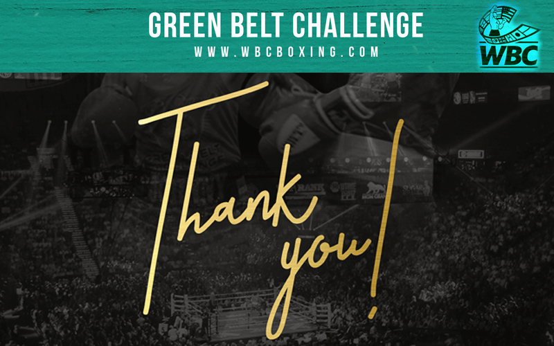 Asegúrese de estar siguiendo todas nuestras páginas de redes sociales para mantenerse al día con todo lo que está haciendo el WBC, incluido el Green Belt Challenge. ¡En nombre del presidente del WBC, Mauricio Sulaiman, ¡les agradecemos su paciencia y el seguir CREYENDO EN EL SUEÑO! ¡Lo prometemos, CONTINUARÁ!